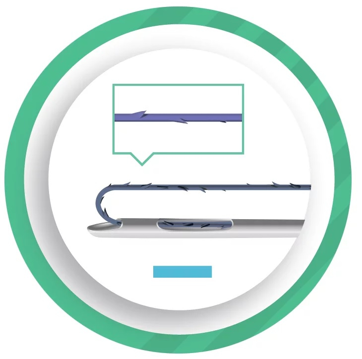 Нить имеет насечки на 360 градусов, расположенные по спирали, благодаря чему длительно удерживает и фиксирует ткани.